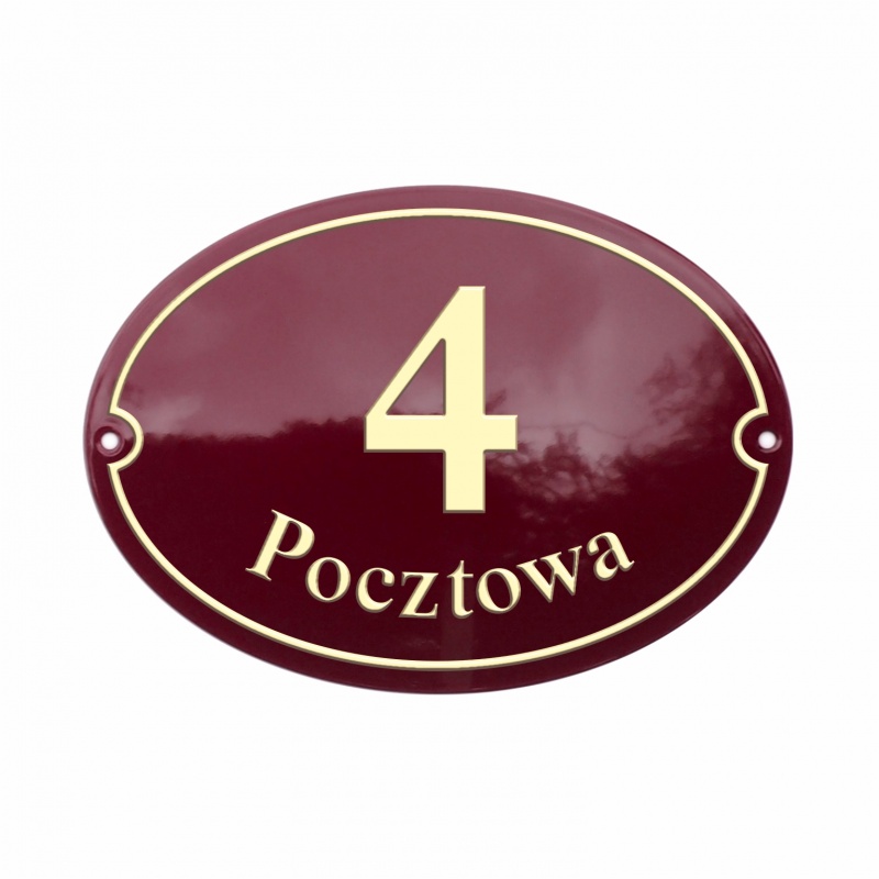 Ręcznie wykonana tabliczka emaliowana o wymiarach 22x16c m, której wzór jest tworzony tradycyjną metodą szablonu. W całości szkliwiona emalią podkładową, dodatkowo jej frontowa część utrwalona w kolorze bordowym. Wzór (ramka + tekst) wykonany z kremowej emalii. Po ostatnim procesie wypalenia w piecu emalierniczym tabliczka jest całkowicie odporna na warunki atmosferyczne oraz długotrwałą ekspozycję na promienie słoneczne. Wraz z upływającym czasem nie zmieni swojego koloru oraz blasku na co otrzymają Państwo naszą dożywotnią gwarancję.
